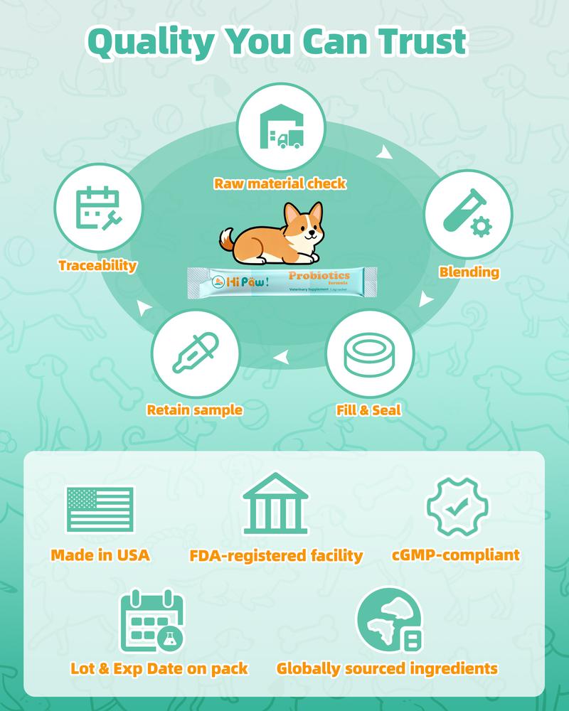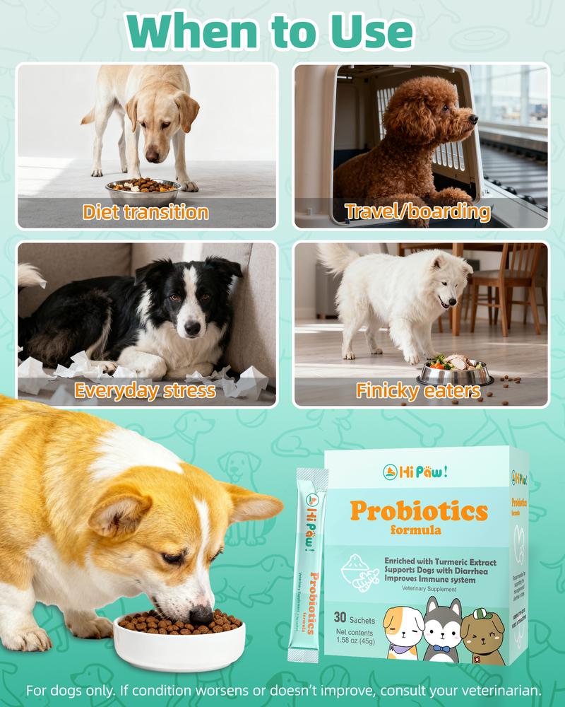 Product Overview:Hi PAW! Probiotics for Dogs with Turmeric is a daily, mix-with-food powder that supports digestive health, maintains healthy stool quality, and promotes gut microbiome balance. Each single-serve sachet contains precise, fresh, and travel-friendly dosing.